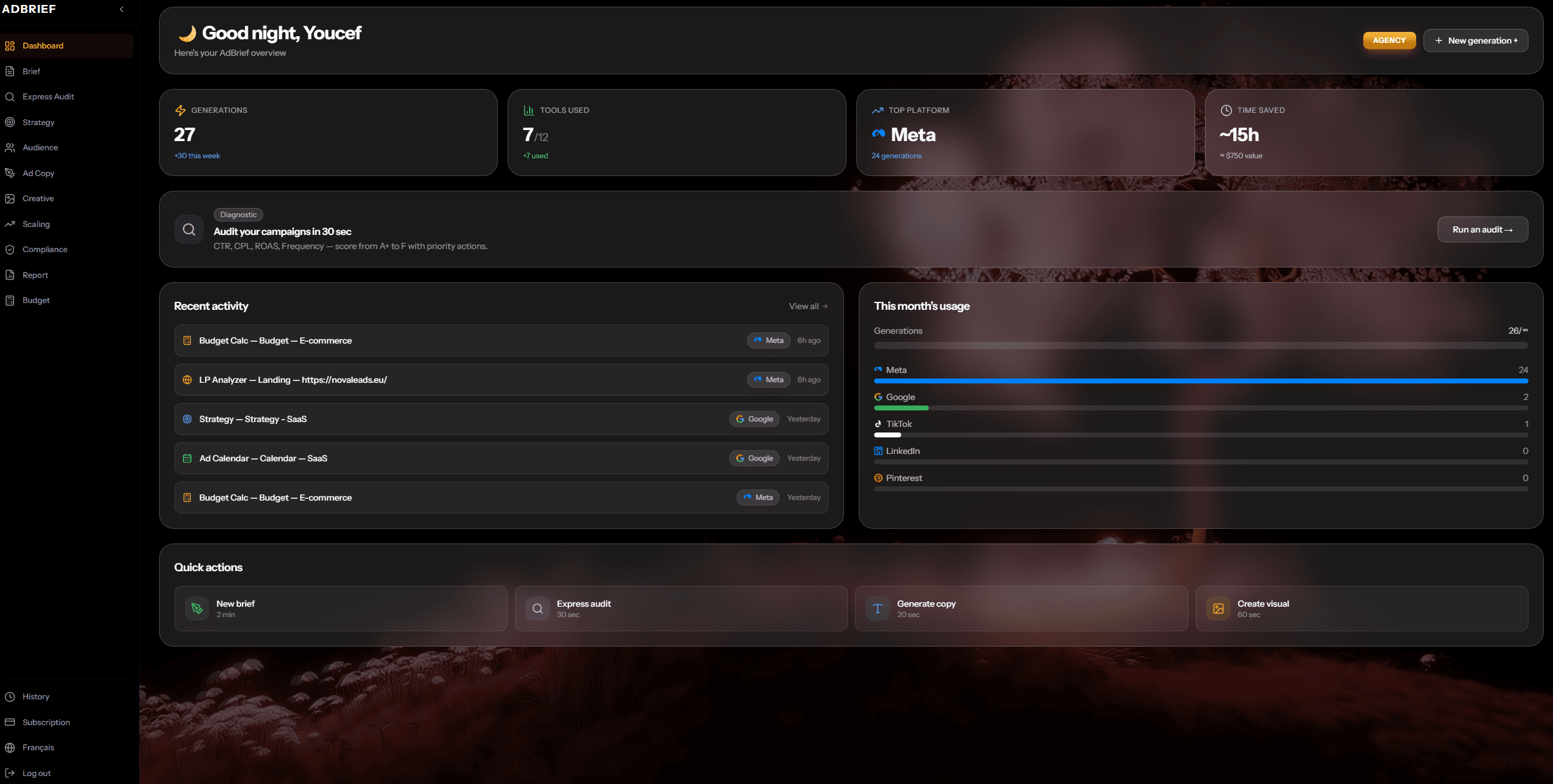 10 specialized AI tools. From brief to report, every aspect of your advertising workflow is covered.